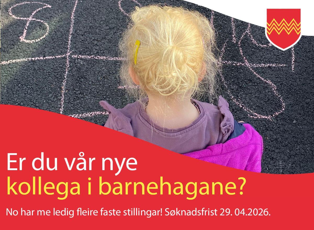 Fleire ledige stillingar i barnehagane våreLytt til tekstenStopp avspillingMe søkjer barnehagelærar, fagarbeidar og assistentar til barnehagane. Søknadsfrist 29. april.I barnehagane våre arbeider me kvar dag for at barna skal oppleve meistring, tryggleik og glede. No treng me fleire dyktige og engasjerte medarbeidarar som vil vere med og gjere ein forskjell i barna sine liv.Årdal kommune har ledig fleire faste stillingar som barnehagelærar og faste stillingar som fagarbeidar/assistent i dei ulike barnehagane.Les meir om stillinga som barnehagelærar her og søk.Les meir om stillinga som fagarbeidar og assistentar her og søk. Sist endra 22.04.2026 11:26